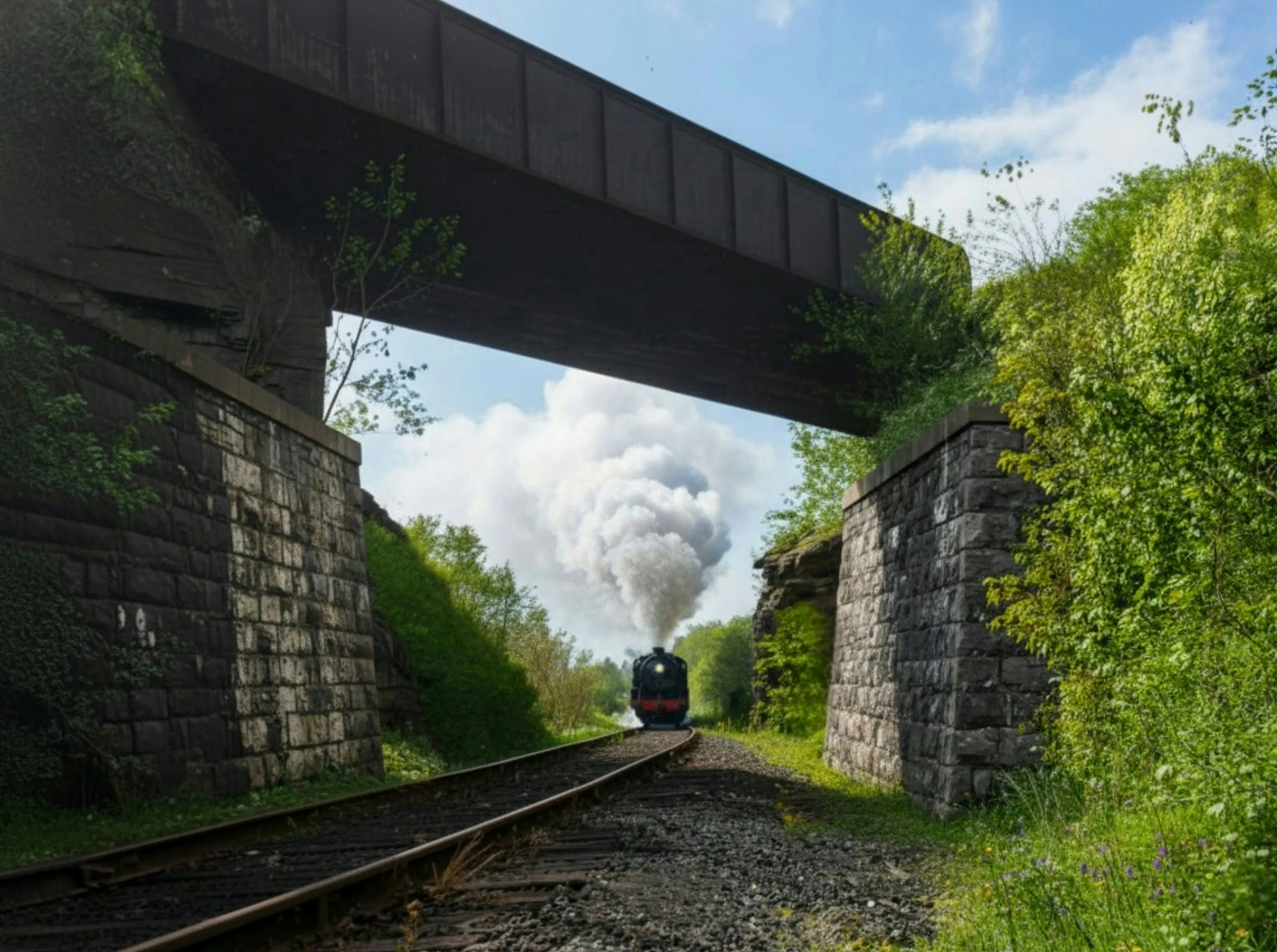 Right - This is a resemblance of the steel plate girder bridge (overpass), built in 1886 by E. Kent Kane, so the Big Level & Kinzua Railroad could cross over the Erie Railroad. (The stone wall abutment is on the right.)